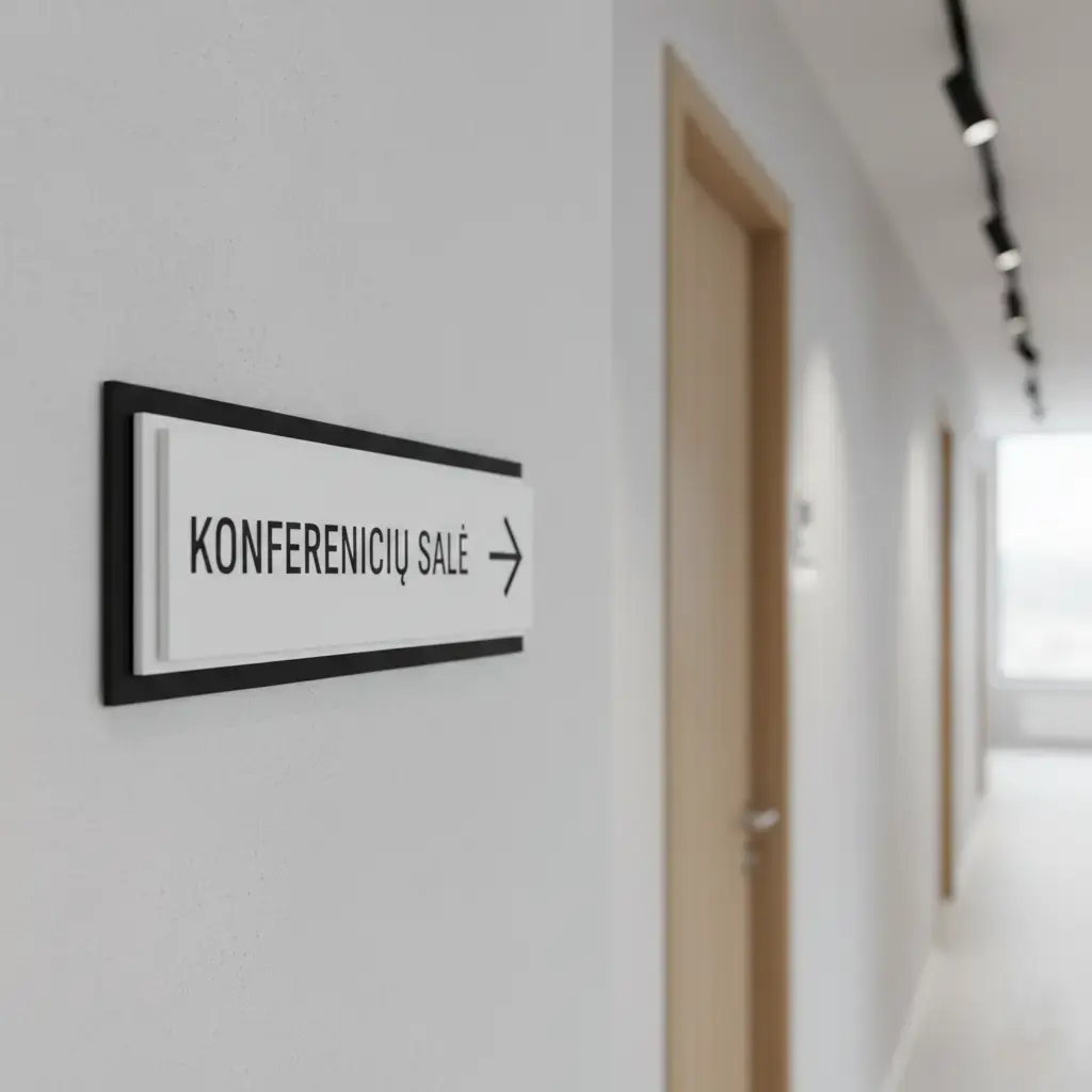 Krypties ir nuorodų ženklai padeda sukurti aiškią, patogią ir profesionalią patalpų navigaciją.