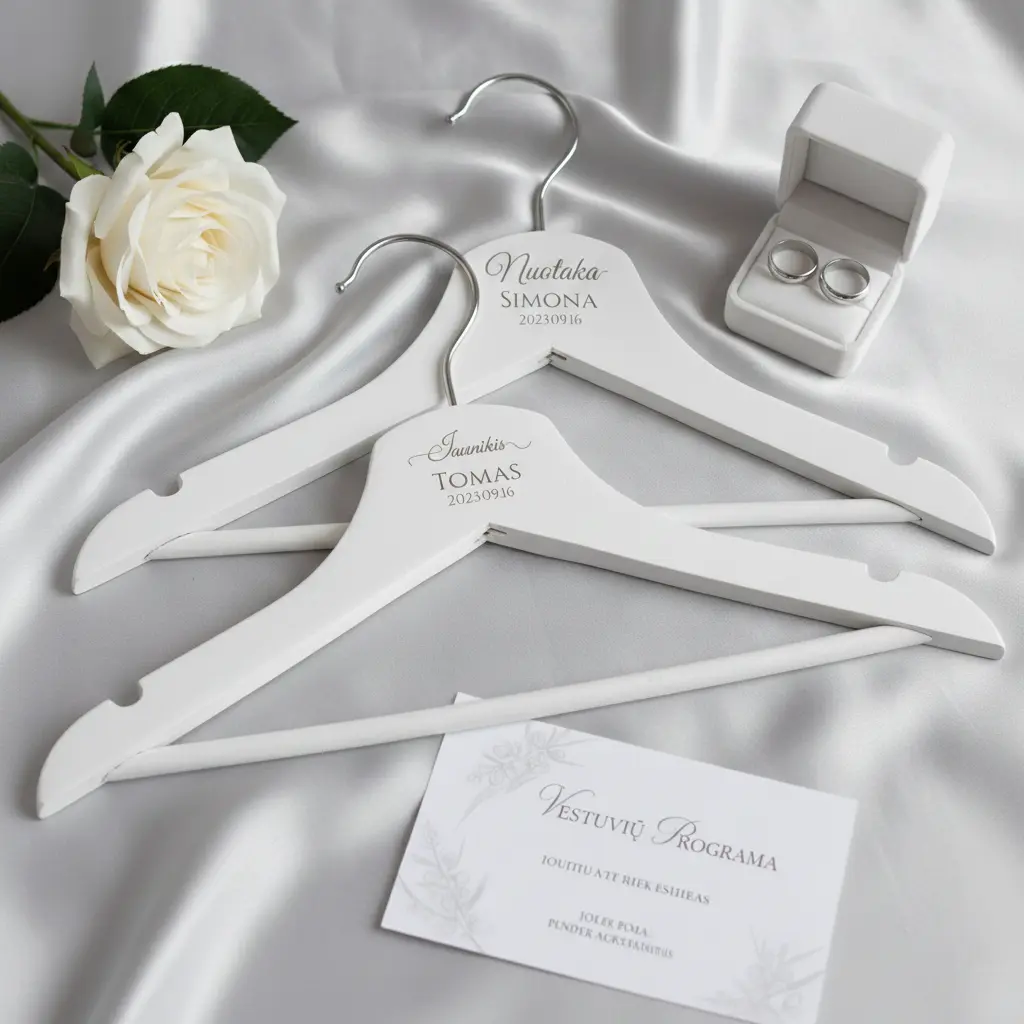 Vestuvės susideda iš tūkstančio smulkmenų, kurios kuria bendrą emociją. Nors nuotraukose matote mūsų populiariausius gaminius – graviruotas vestuvines pakabas bei luxury stiliaus vardines korteles – mūsų kūrybinės galimybės tuo tikrai nesibaigia.